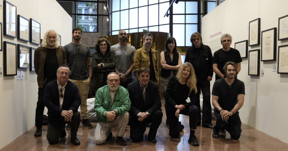 Pie de foto → Abajo en el centro: Luis García Montero, director del Instituto Cervantes, acompañado por diferentes cantautores que han participado en la inauguración de la exposición, entre ellos: Christina Rosenvinge, El Chojín, Tulsa, Juanma Latorre (Vetusta Morla), Rosa León, Nacho Vegas y Pedro Guerra. Foto: Instituto Cervantes / Fernando Gutiérrez Llorente.