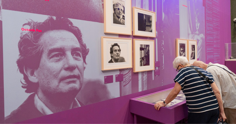 Pie de foto → Visitantes de la muestra observan el espacio dedicado a las imágenes de Sara Facio al lado de una de las fotografías del escritor Octavio Paz. Foto: Instituto Cervantes / Alba Pacheco Bravo.