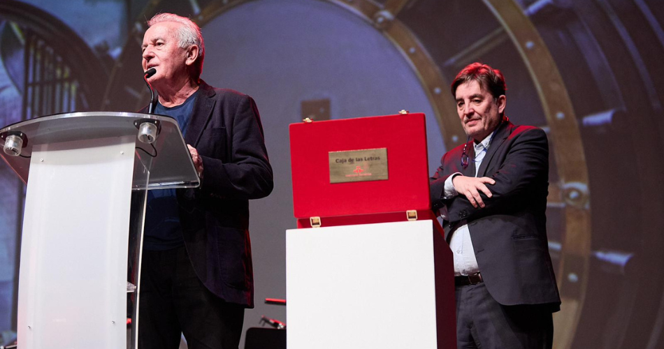 Sobre el gran escenario del auditorio, y con una fotografía de la Caja de las Letras como telón de fondo, García Montero reiteró el «gran honor» de recibir este legado, que se suma a los que en las anteriores Reuniones Anuales de Directores dejaron Ángela Molina (en San Sebastián en 2022) y Miguel Ríos (en Granada, en 2023).